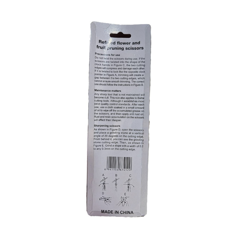 قیچی هرس گل و میوه مرغوب مناسب برای باغبانی می باشد ، اقدامات احتیاطی برای استفاده : قیچی را در حین استفاده نچرخانید. اگر قیچی به شکل عقربههای ساعت پیچانده شود، دو لبه برش به هم فشرده شده و به یکدیگر آسیب میرسانند. اگر به شکل عقربه ساعت پیچانده شود، برش باعث ایجاد فاصله بین دو لبه برش میشود که نمیتواند برش صاف را تضمین کند. برای استفاده صحیح باید دستورالعملهای شکل ب را دنبال کنید.