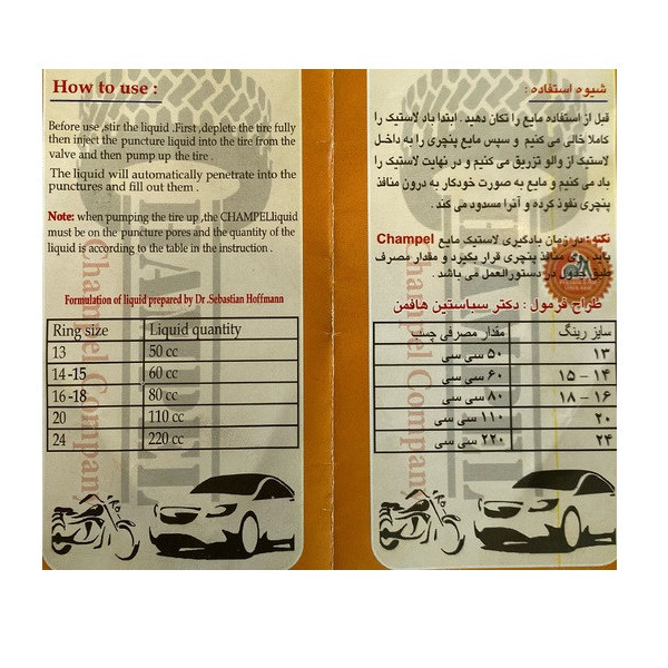مناسب برای پنچری های 1 تا 6 میلیمتر انواع لاستیک های بدون تیوپ است.باید لاستیک را جدا کنید یا خودرو را روی جک بگذارید و سوزن والف را باز کنید و سر ظرف را با قیچی یا کاتر و یا .. از باریکترین قسمت ببرید و ژل را در والف بریزید و سوزن والف را ببندید و لاستیک را چند جهت حرکت دهید تا ژل پخش شود و سپس لاستیک را باد کنید و ژل خود به خود روزنه های کوچک را می بندد