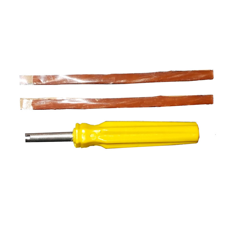 این محصول شامل یک عدد درفش فلزی با دسته پلاستیکی برای سنباده زدن محل پنچری و یک عدد قلاب مخصوص جاگذاری نخ پنچری با دسته پلاستیکی و دو عدد نخ پنچرگیری و یک آچار والف باز کن است. |